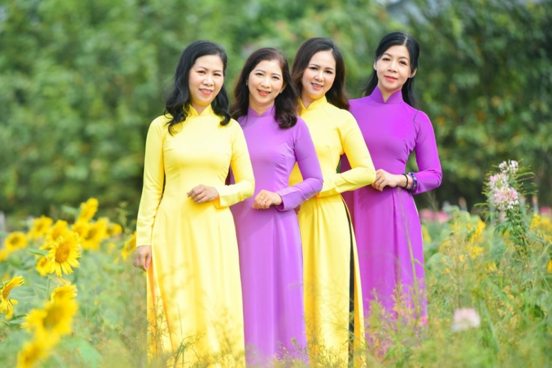 Cách tạo dáng chụp ảnh áo dài nhóm với hoa là một gợi ý lý tưởng để tôn lên vẻ đẹp mềm mại và tinh tế của tà áo dài. Mọi người có thể cùng cầm bó hoa hoặc đứng bên vườn hoa rực rỡ. Cách này sẽ giúp bạn có được những bức ảnh vừa nữ tính, vừa ngọt ngào.