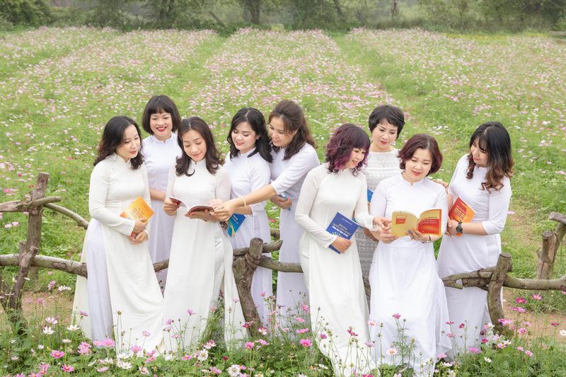 Sách cũng là một phụ kiện thú vị khi chụp ảnh áo dài. Nhóm bạn có thể tạo dáng đọc sách hoặc cầm sách một cách tự nhiên. Cách tạo dáng chụp ảnh áo dài nhóm này vừa giúp thể hiện vẻ đẹp trí thức, vừa mang đến cảm giác nhẹ nhàng và thanh lịch.