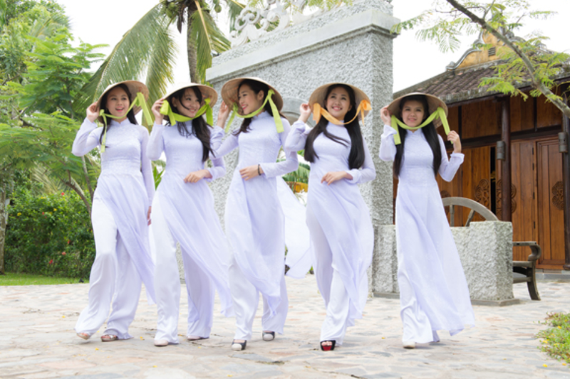 Chụp ảnh áo dài nhóm với nón lá