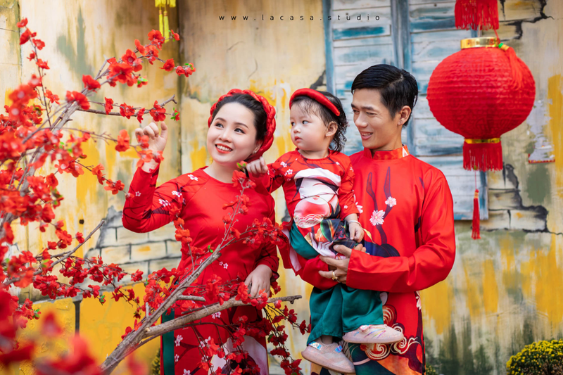 Tạo dáng chụp ảnh áo dài Tết với gia đình