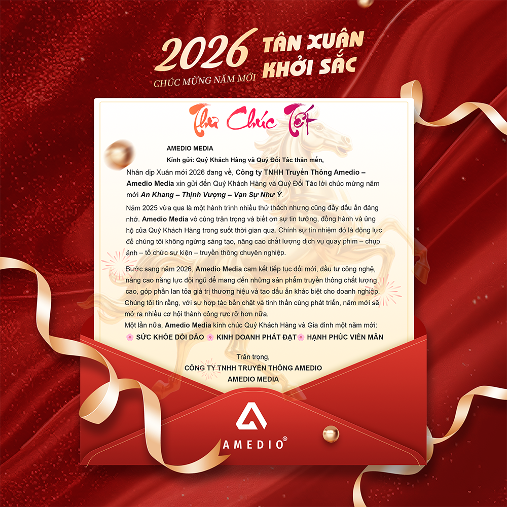 Nhân dịp Xuân 2026, Amedio Media xin gửi lời chúc mừng năm mới và tri ân sâu sắc đến Quý Khách Hàng, Quý Đối Tác đã tin tưởng sử dụng dịch vụ quay phim sự kiện, chụp ảnh chuyên nghiệp, tổ chức sự kiện và truyền thông doanh nghiệp trong suốt năm 2025.