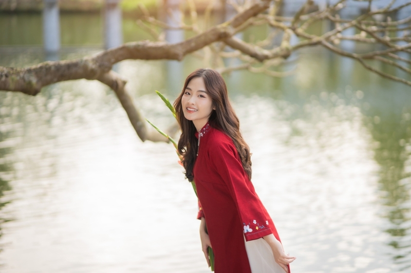 Hãy cầm một cành hoa mai, hoa đào đưa lên gần mặt hoặc cúi đầu ngắm hoa. Hoa mai, hoa đào là biểu tượng của Tết, giúp bức ảnh thêm phần rực rỡ, tươi mới và lãng mạn.